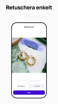 Glöm komplicerade designprogram! Beskriv bara din idé, och Photoroom AI skapar omedelbart skräddarsydda bakgrunder, tilltalande element för sociala medier, scener och logotyper. Förbättra produktbilder med intelligenta bakgrundsbyten och AI-genererade miljöer, eller använd det smarta suddgummit för att finjustera detaljer och eliminera störande inslag. Den avancerade fotoredigeraren hjälper dig att rensa upp bilder, ta bort oönskade objekt och justera ljus, skuggor och skärpa för ett felfritt resultat, varje gång. Photoroom gör det möjligt att framhäva kläder på realistiska virtuella modeller och placera produkter i fantastiska iscensatta miljöer, vilket garanterar bilder av högsta kvalitet.