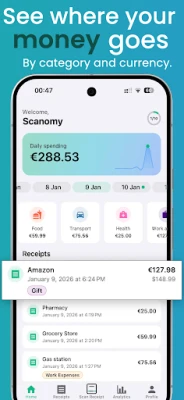 Scanomy tar din ekonomiska kontroll till nästa nivå. Jämför priser på specifika varor mellan olika butiker och följ pristrender över tid för att optimera dina inköp. Perfekt för den globala resenären eller digitala nomaden, appen kan skanna kvitton på över 30 språk och erbjuder omedelbar översättning. Behöver du en översikt? Exportera enkelt dina utgifter till detaljerade rapporter i CSV eller Excel (XLSX) för budgetering, bokföring eller djupare analys. Scanomy är den ultimata lösningen för privatpersoner, frilansare och småföretag som vill automatisera sin ekonomi. Dina data är alltid säkra och privata, och används aldrig för reklam – din integritet är vår högsta prioritet.