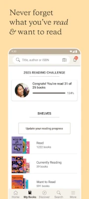 Med Goodreads blir det en lek att hitta din nästa fängslande läsupplevelse. Få skräddarsydda boktips direkt baserade på dina unika smaker och preferenser. Utforska utvalda titlar och genrer för att bredda dina vyer, eller se vad dina vänner för närvarande fördjupar sig i för att hitta inspiration. Den smarta funktionen att skanna bokomslag ger dig omedelbar tillgång till recensioner och låter dig enkelt lägga till böcker på din "Vill läsa"-lista.