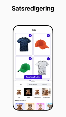 Glöm komplicerade designprogram! Beskriv bara din idé, och Photoroom AI skapar omedelbart skräddarsydda bakgrunder, tilltalande element för sociala medier, scener och logotyper. Förbättra produktbilder med intelligenta bakgrundsbyten och AI-genererade miljöer, eller använd det smarta suddgummit för att finjustera detaljer och eliminera störande inslag. Den avancerade fotoredigeraren hjälper dig att rensa upp bilder, ta bort oönskade objekt och justera ljus, skuggor och skärpa för ett felfritt resultat, varje gång. Photoroom gör det möjligt att framhäva kläder på realistiska virtuella modeller och placera produkter i fantastiska iscensatta miljöer, vilket garanterar bilder av högsta kvalitet.